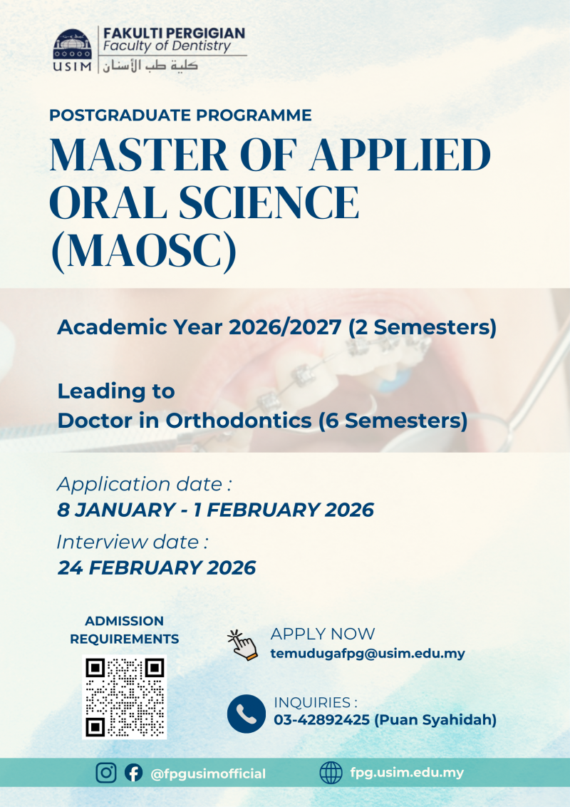 Advance your professional journey with the Master of Applied Oral Sciences (MAOSc), leading to the Doctor in Orthodontics. Applications for the 2026/2027 intake are now open. Come join us at our Pandan Indah, Ampang campus.