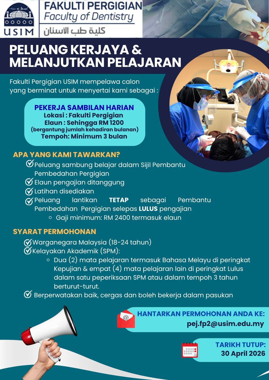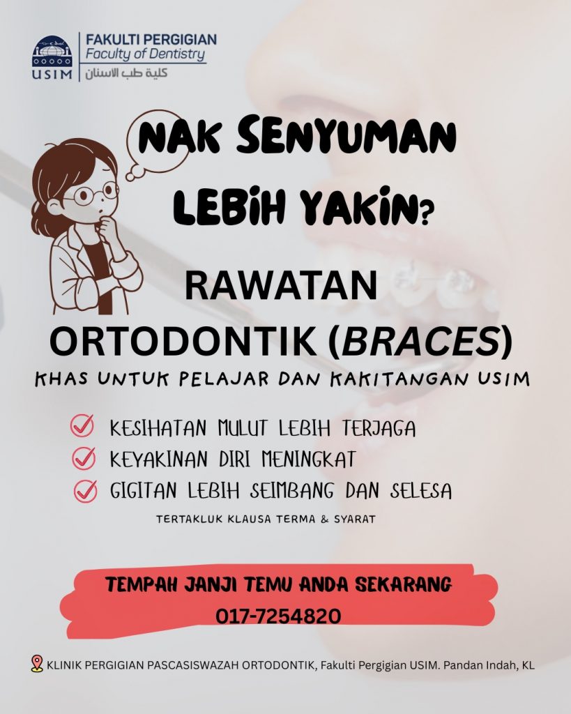 Guided by the principles of ihsan and professional excellence, the Faculty of Dentistry at Universiti Sains Islam Malaysia is dedicated to delivering comprehensive clinical dental services to the public in a compassionate, ethical, and patient-centred environment. Our clinical services are open to all members of the community, without distinction of ethnicity, race, or background. Through inclusive care and responsible practice, the Faculty seeks to promote oral health, uphold human dignity, and contribute positively to the well-being of society.